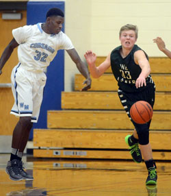 West Bloomfield’s #33 Zach Allread steals a pass in front of Waterford Mott’s #32 Dmonta Harris during their game at Waterford Mott High School, Thursday December 12, 2013. West Bloomfield went on to win the game 55-52. (Vaughn Gurganian-The Oakland Press)